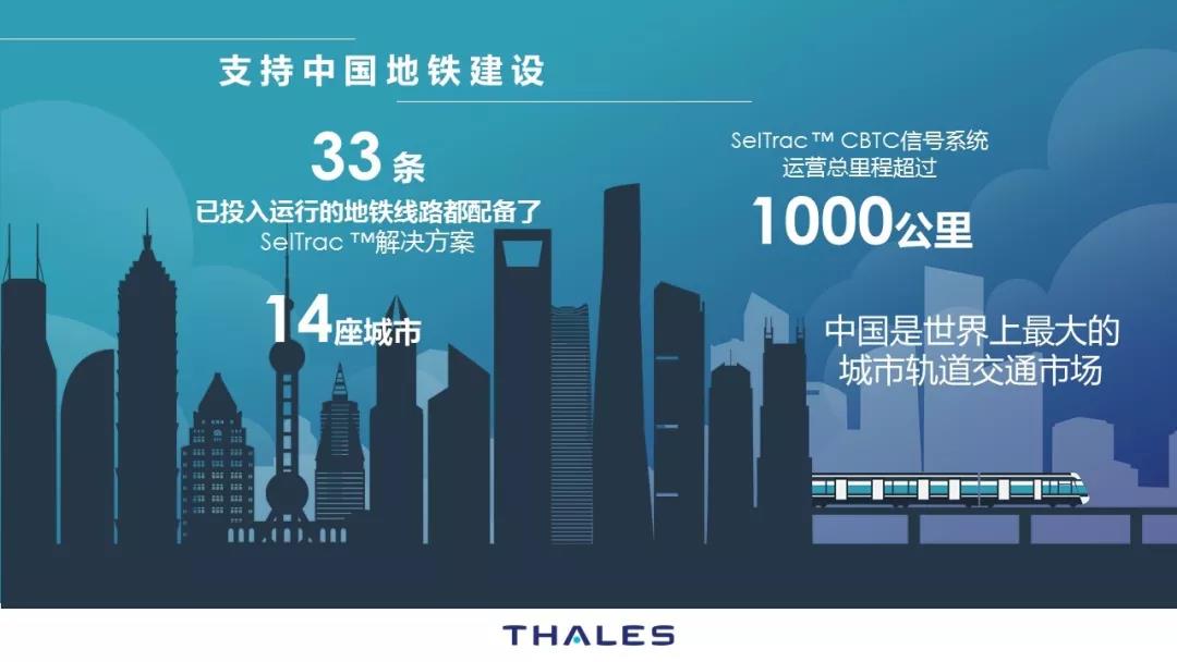 泰雷茲通過其合資公司上海電氣泰雷茲交通自動化系統有限公司為中國大型城市(包括北京、上海、廣州、深圳、武漢、南京、南昌、合肥、青島、石家莊、寧波、濟南等14 個城市的33條線路)的軌道交通網提供先進的CBTC 信號系統,總里程 1280 公里。