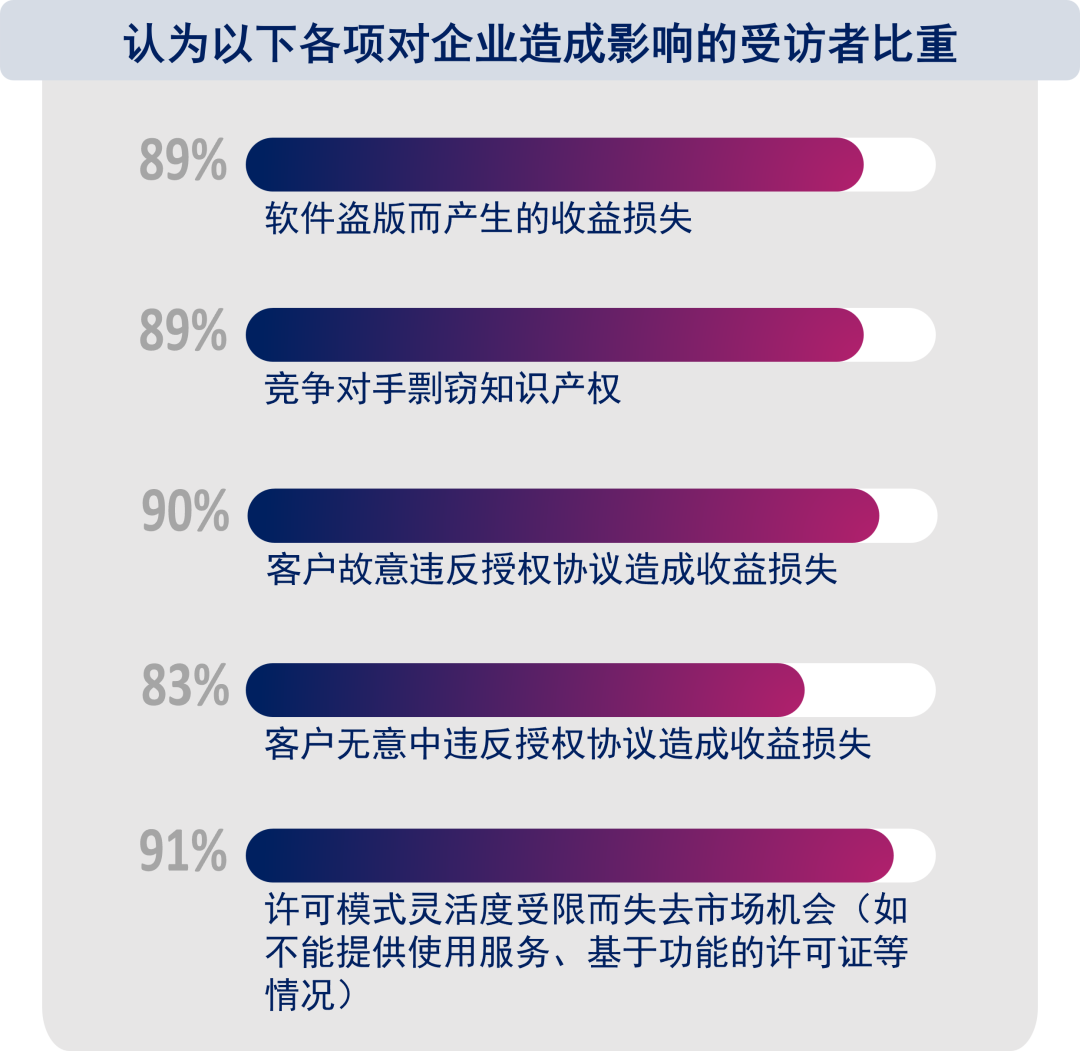 數字時代前進的步伐已勢如破竹,而軟件則承載著各大廠商的核心競爭力,軟件受到侵害,核心競爭力首當其沖。據報告顯示,90%的廠商擔心軟件會遭到侵害,據估計,其中有超過四分之一的軟件未經許可被濫用或盜用,導致效益、競爭力、業(yè)務機會等方面的利益受損。然而,維系客戶關系仍是軟件廠商未來長期收入的“黑馬”,如何在保護自身知識產權的同時還能夠打造可持續(xù)的業(yè)務收入模式,平衡二者關系成為了軟件廠商需要面對的挑戰(zhàn)。
