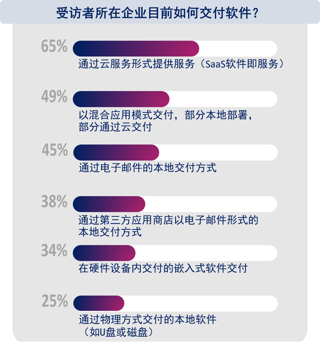 報告中,很多受訪者所在企業(yè)認為SaaS模式對未來業(yè)務具有積極促進作用,并且已經開始通過云來提供SaaS服務。其實,對比本地部署軟件的 “一次性永久”的交付和銷售模式,SaaS交付所采用的訂閱模式更偏向為一種基于 “關系”的業(yè)務模式,它可以讓軟件商與其客戶保持著持久的、緊密的業(yè)務聯(lián)系,且創(chuàng)造可復購的、可預測的收入流。