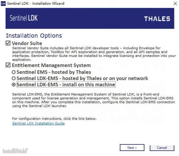 9、安裝過程中出現這個界面時,除了前面兩個框打勾外,下面那個請選擇”Sentinel LDK EMS –install on this machine”