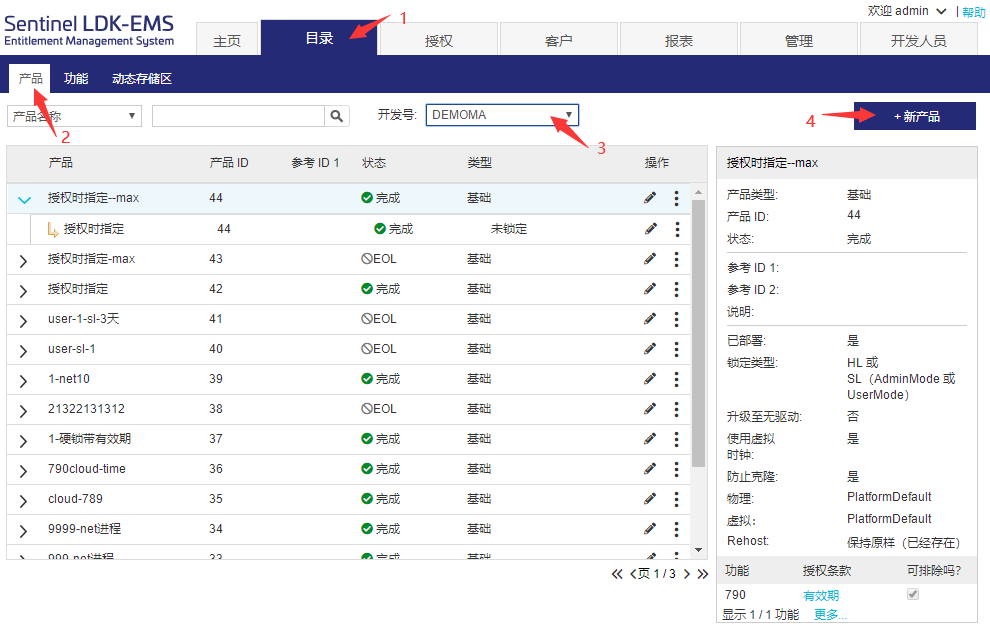 請按圖示步驟選擇1目錄,2產品,3開發號,4新建產品,其中開發號是對應5個字母的主鎖開發號,測試用戶請選擇DEMOMA
